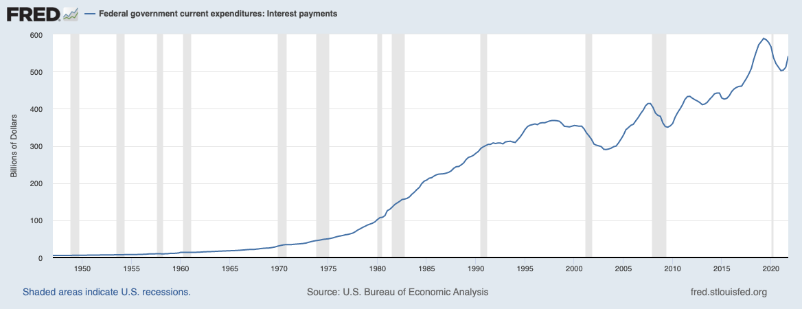 The interest payment on this debt currently at an interest rate of between 0.00 – 0.025% is approx. 540Billion US-Dollars as can be seen from the below chart.